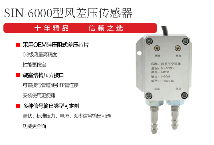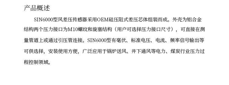 SIN6000型風差壓傳感器采用OEM硅壓阻式差壓芯體組裝而成。外殼為鋁合金結構兩個壓力接口為M10螺紋和旋塞結構(用戶可選擇壓力接口尺寸),可直接在測量管道上或通過引壓管連接。SIN6000型有毫伏、標準電壓、電流、頻率信號輸出等可供選擇,安裝使用方便,廣泛應用于鍋爐送風、井下通風等電力、煤炭行業壓力過程控制領域。